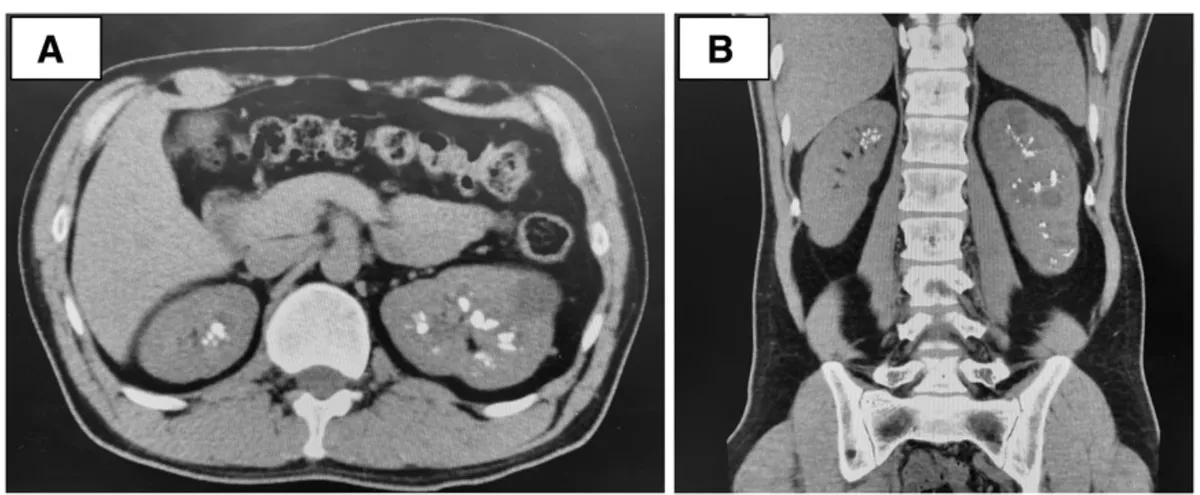 Os achados da TC sem contraste revelaram rins aumentados de tamanho, múltiplos cistos renais e nefrocalcinose (Figura 1).