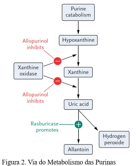 Os ácidos nucleicos purínicos são normalmente metabolizados, em taxas fisiológicas, para hipoxantina, xantina, ácido úrico e alantoína. Os inibidores da xantina-oxidase (alopurinol e febuxostate) reduzem os níveis de ácido úrico ao inibir a conversão de hipoxantina e xantina em ácido úrico. A rasburicase promove a conversão do ácido úrico em alantoína, um metabólito muito mais solúvel, facilitando sua excreção renal.
